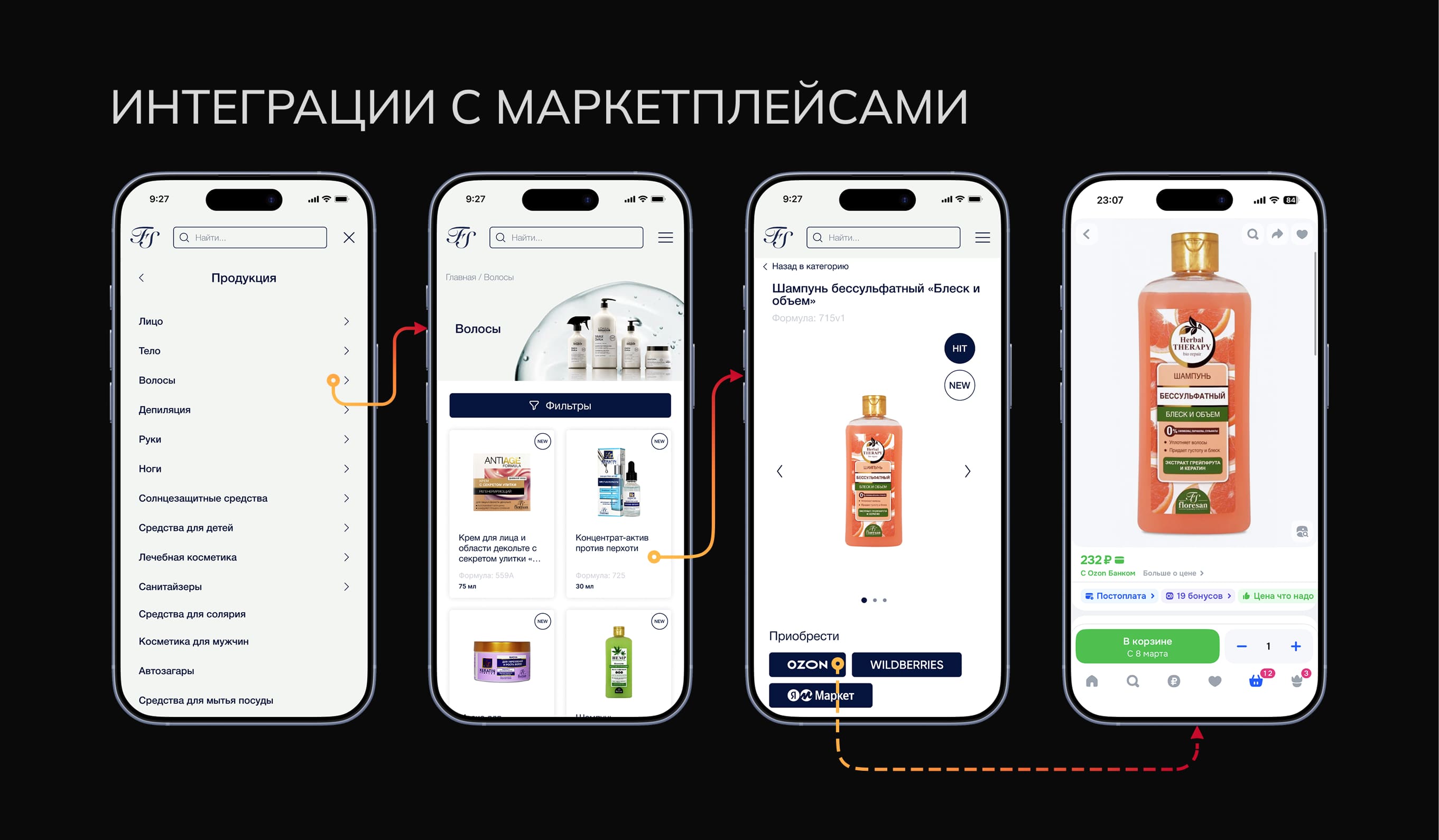 В карточках товаров реализована возможность перехода на соответствующие страницы продукции на маркетплейсах — Wildberries, Ozon и Яндекс Маркете.